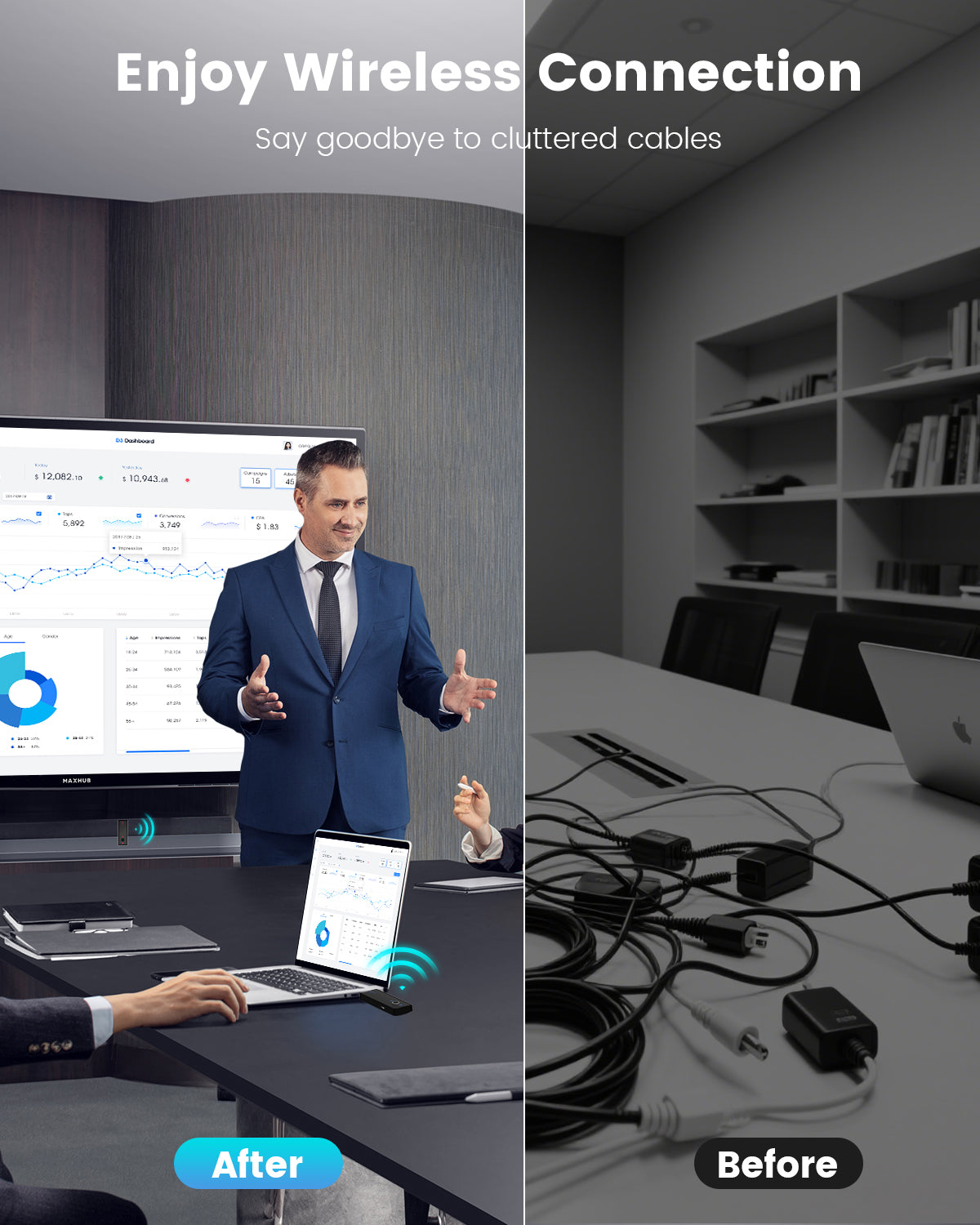 【Plug and Play】Experience plug and play convenience with this 4K wireless HDMI transmitter and receiver. It requires no Wi-Fi, apps, Bluetooth, or complicated setup—connect your devices in seconds. Designed for effortless operation, it delivers seamless, high-quality streaming with ultra-low latency, all while keeping your workspace clean and clutter-free.